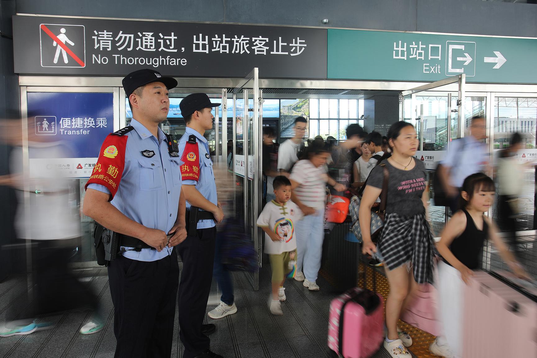 圖為7月3日,民警在車站進站口執(zhí)勤。