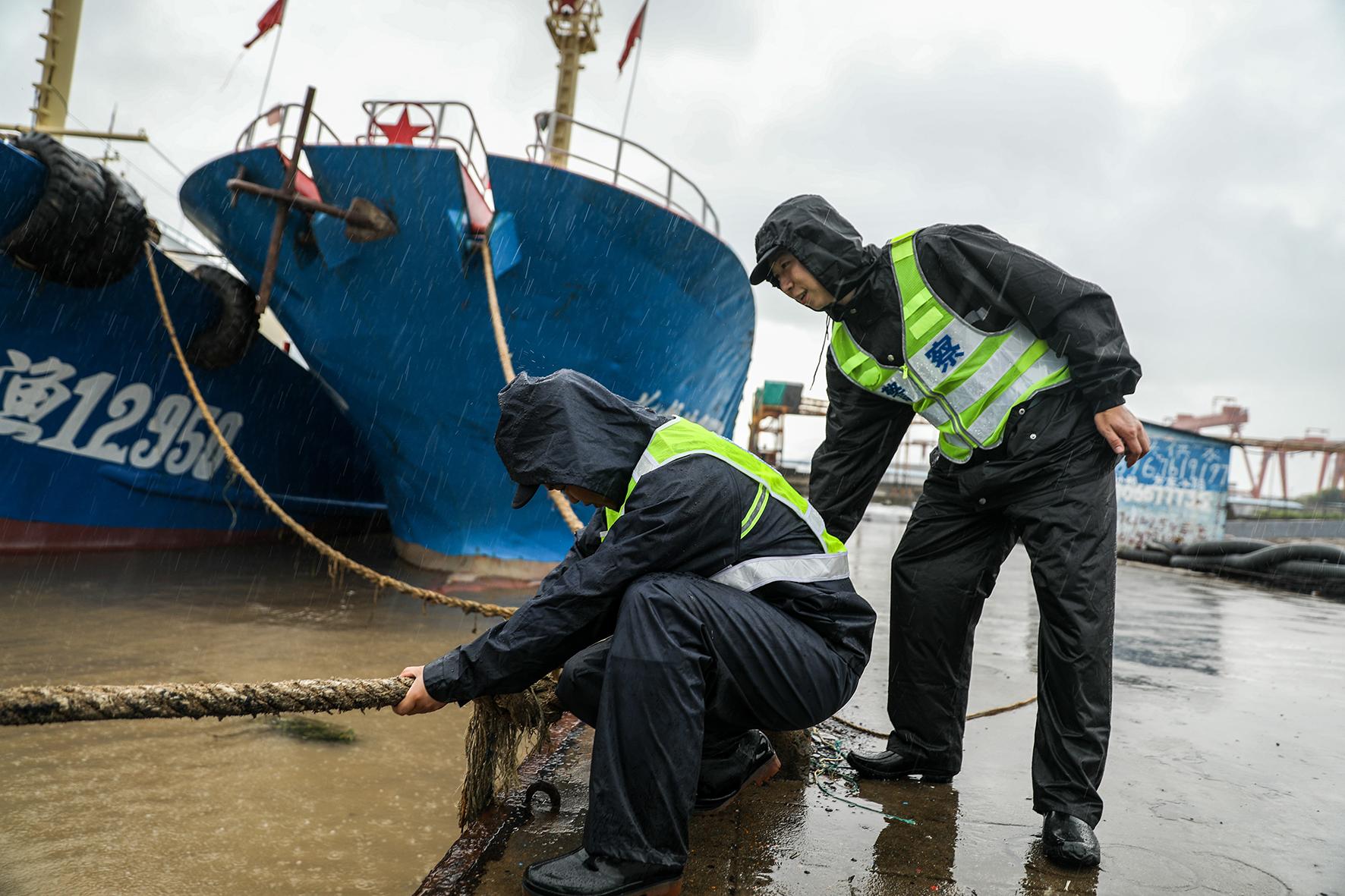 7月8日,今年第4號(hào)臺(tái)風(fēng)“丹娜絲”逼近浙江沿海,浙江省臺(tái)州市公安局椒江分局前所派出所民警輔警深入碼頭開展抗臺(tái)風(fēng)工作。