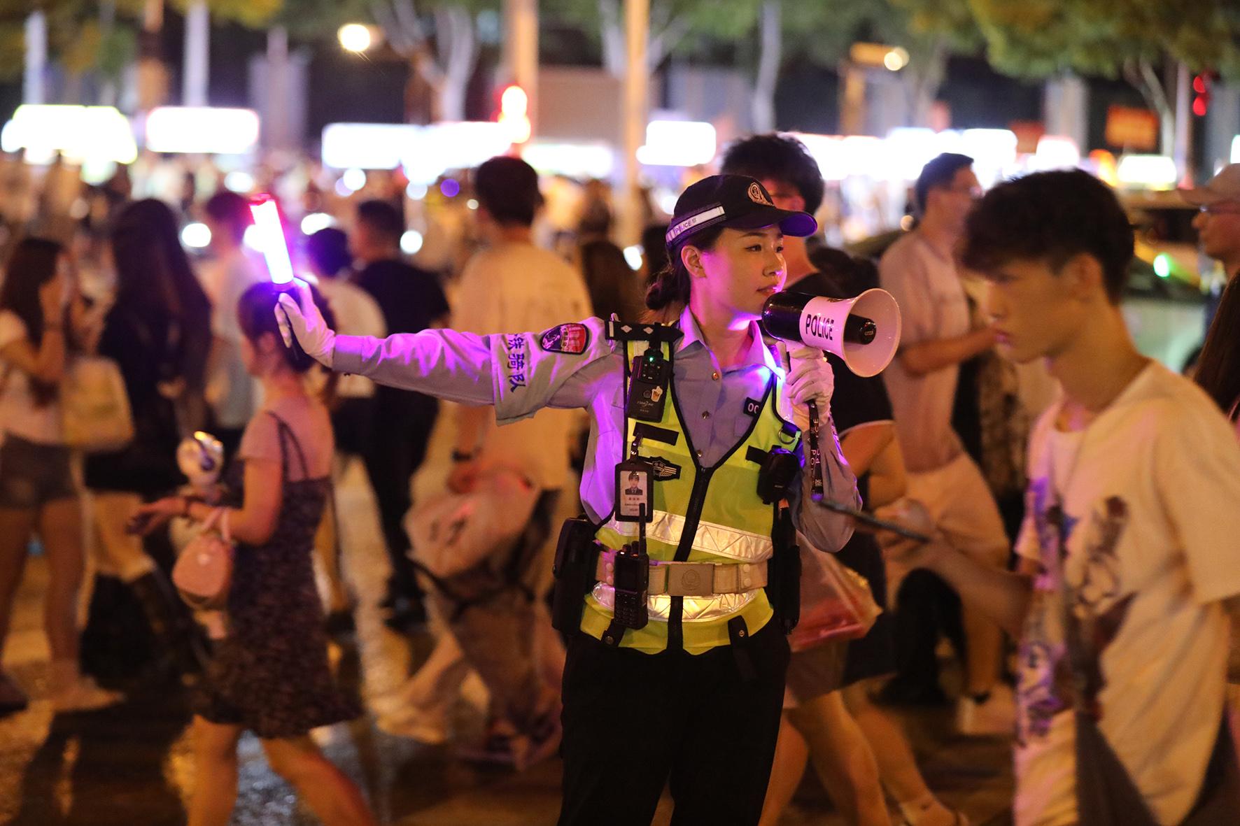 7月19日晚,安徽省合肥市公安局交警支隊民警在演出場館周邊維護道路交通秩序。