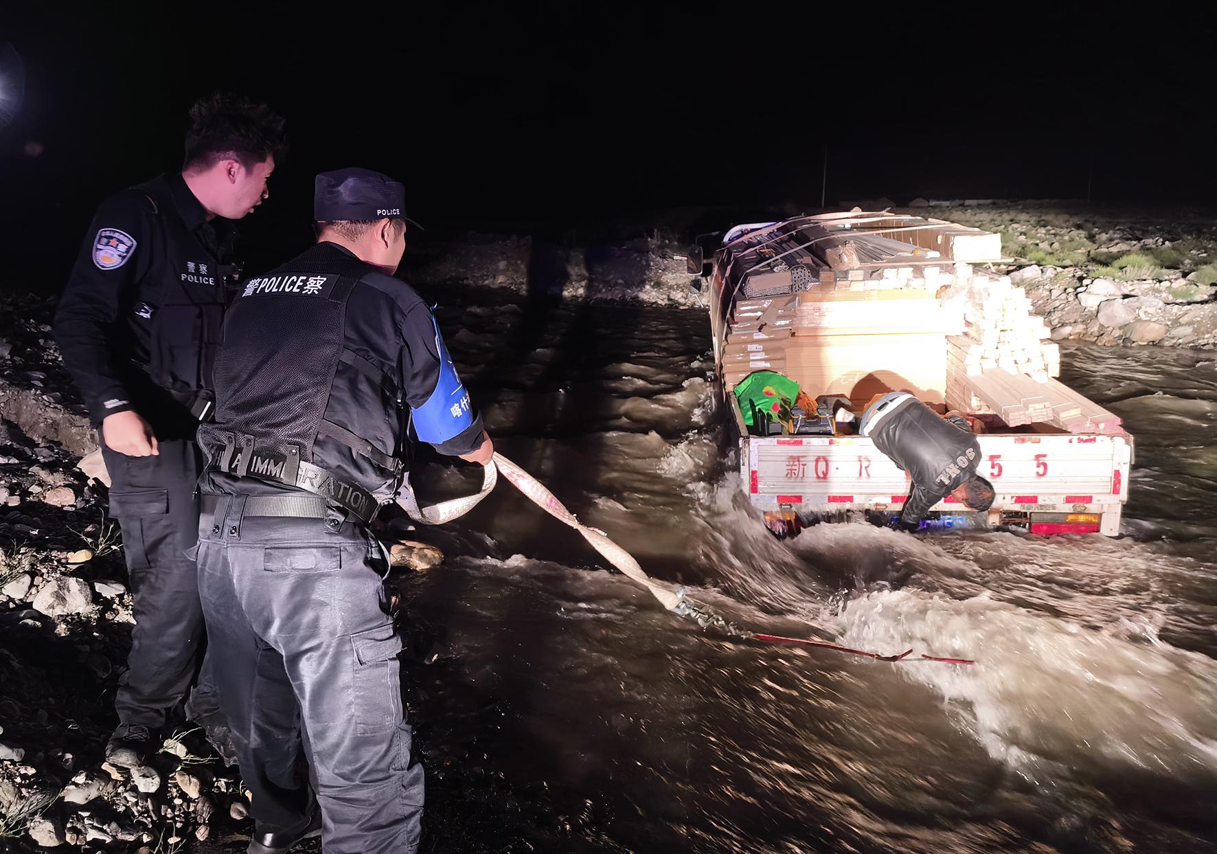 7月30日凌晨1時許,新疆喀什邊境管理支隊達(dá)布達(dá)爾邊境派出所接群眾報警求助稱:一輛滿載建筑物資的車輛被困河道中央。接警后,達(dá)布達(dá)爾邊境派出所迅速啟動應(yīng)急預(yù)案,組織民警攜帶救援設(shè)備前往事發(fā)地點展開救援。歷時約2小時,將被困車輛轉(zhuǎn)移至安全區(qū)域。