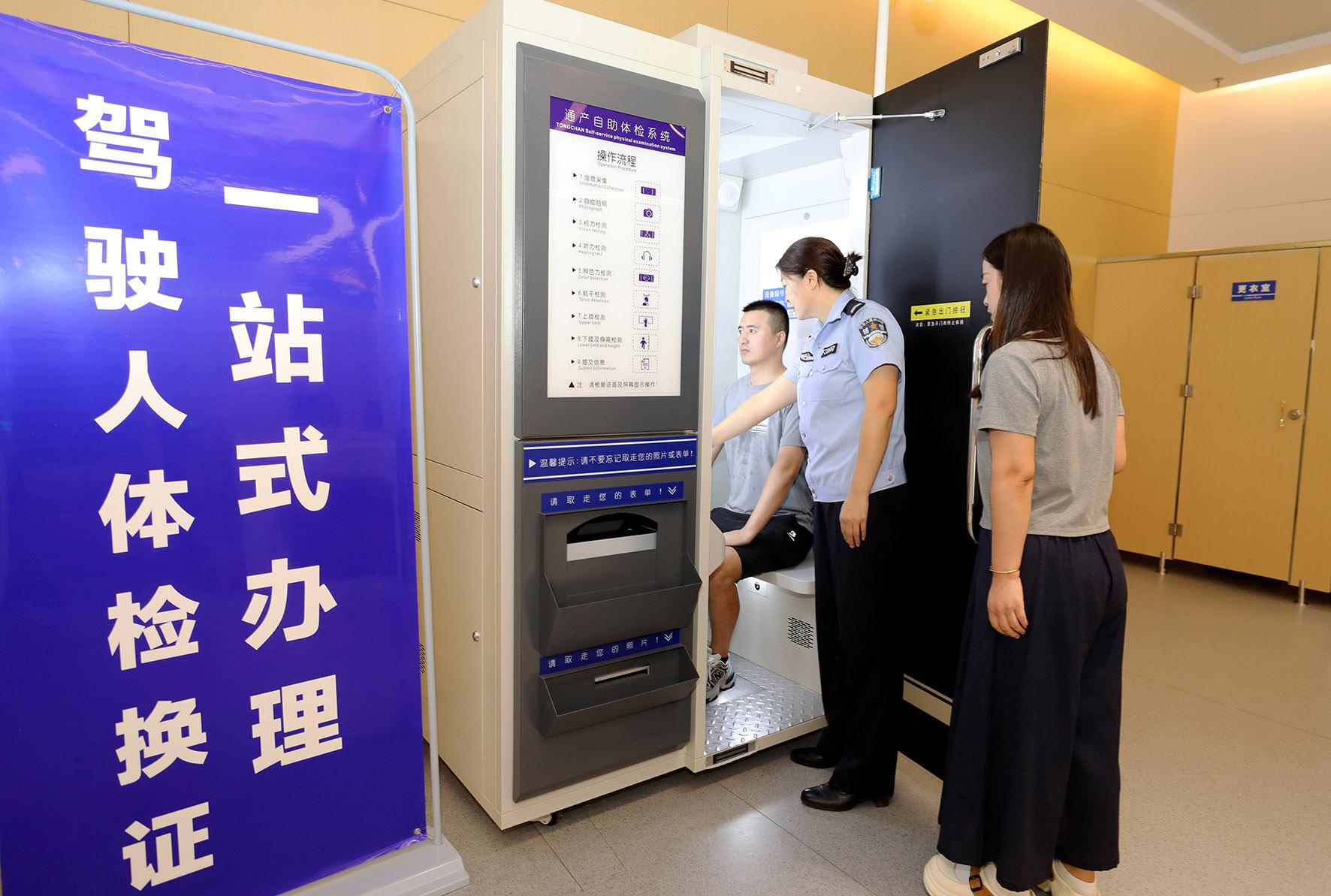 8月20日,安徽省淮北市政務(wù)服務(wù)大廳公安綜合窗口,工作人員指導(dǎo)換領(lǐng)駕駛證的群眾使用智能體檢設(shè)備。當(dāng)日,淮北市政務(wù)服務(wù)大廳公安綜合窗口駕駛?cè)酥悄茏灾w檢機(jī)投入使用,設(shè)備配備AI輔助診斷系統(tǒng)和后臺醫(yī)生審核。