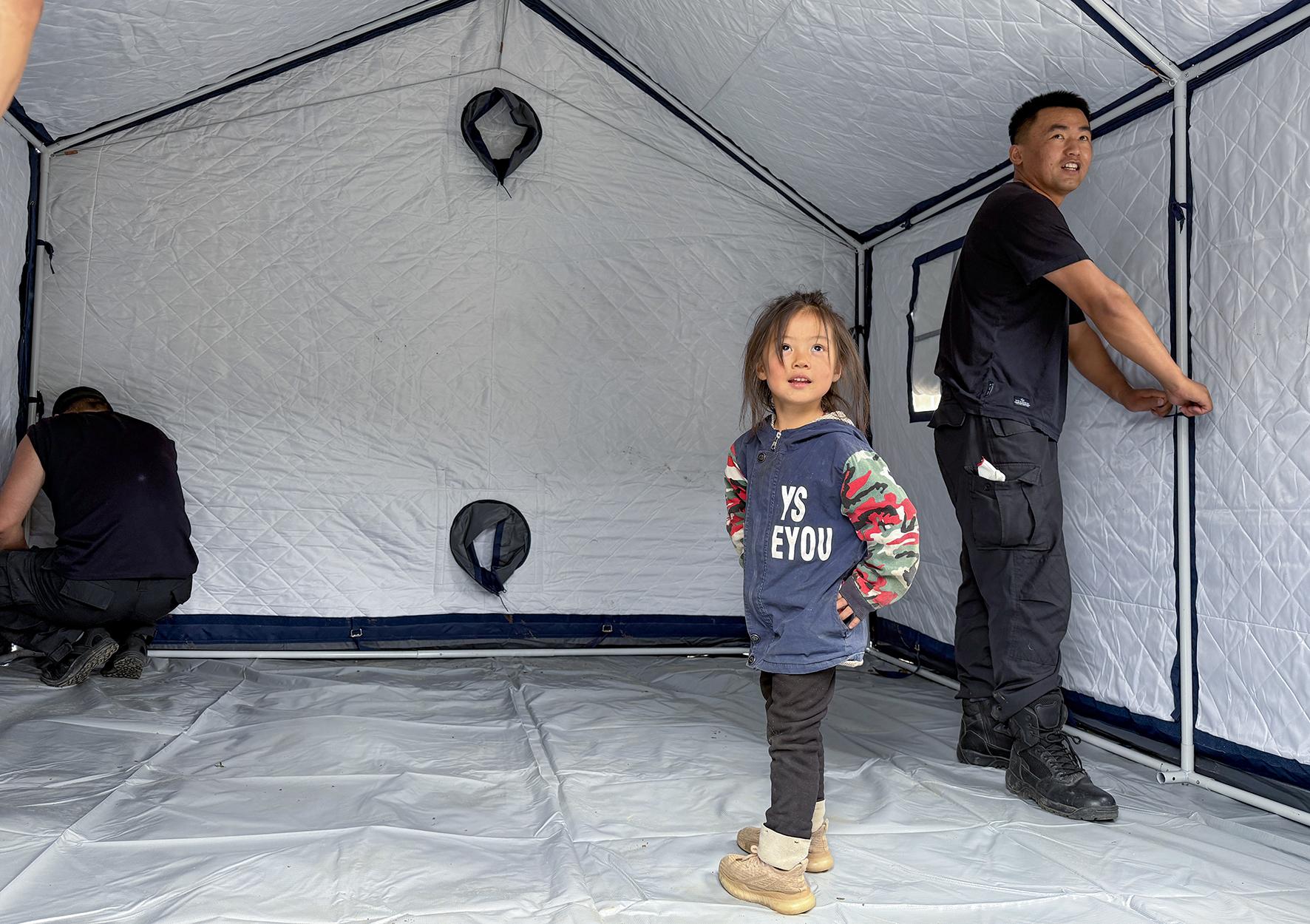 8月10日,瑤瑤在帳篷里和“民警叔叔”擊掌。張翔 攝