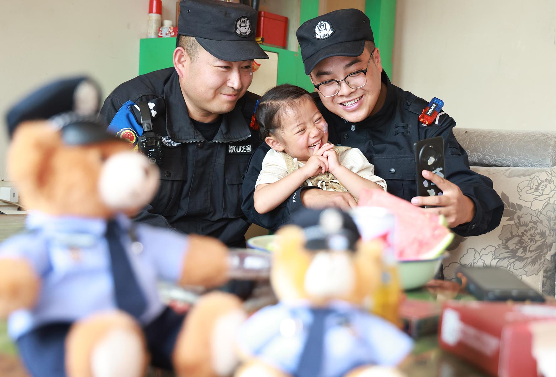 當(dāng)晚,民警們要輪崗去其他點(diǎn)位執(zhí)勤?,幀幖绷耍o緊拉住蘇明凱的手,哭著說(shuō):“叔叔別走!別走嘛……”看著孩子哭得通紅的小臉,蘇明凱柔聲承諾:“瑤瑤乖,叔叔過(guò)幾天就回來(lái)看你,好不好?”瑤瑤抽噎著說(shuō):“那……那我要兩個(gè)‘貼貼’!”
