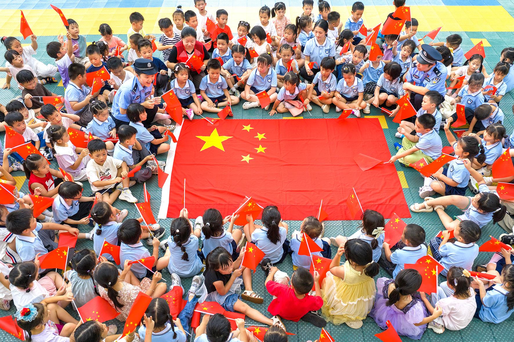 9月25日,浙江省臺州市公安局黃巖分局城東派出所民警和東城街道方山社區(qū)志愿者一起走進(jìn)轄區(qū)幼兒園,給孩子們講解國旗知識。