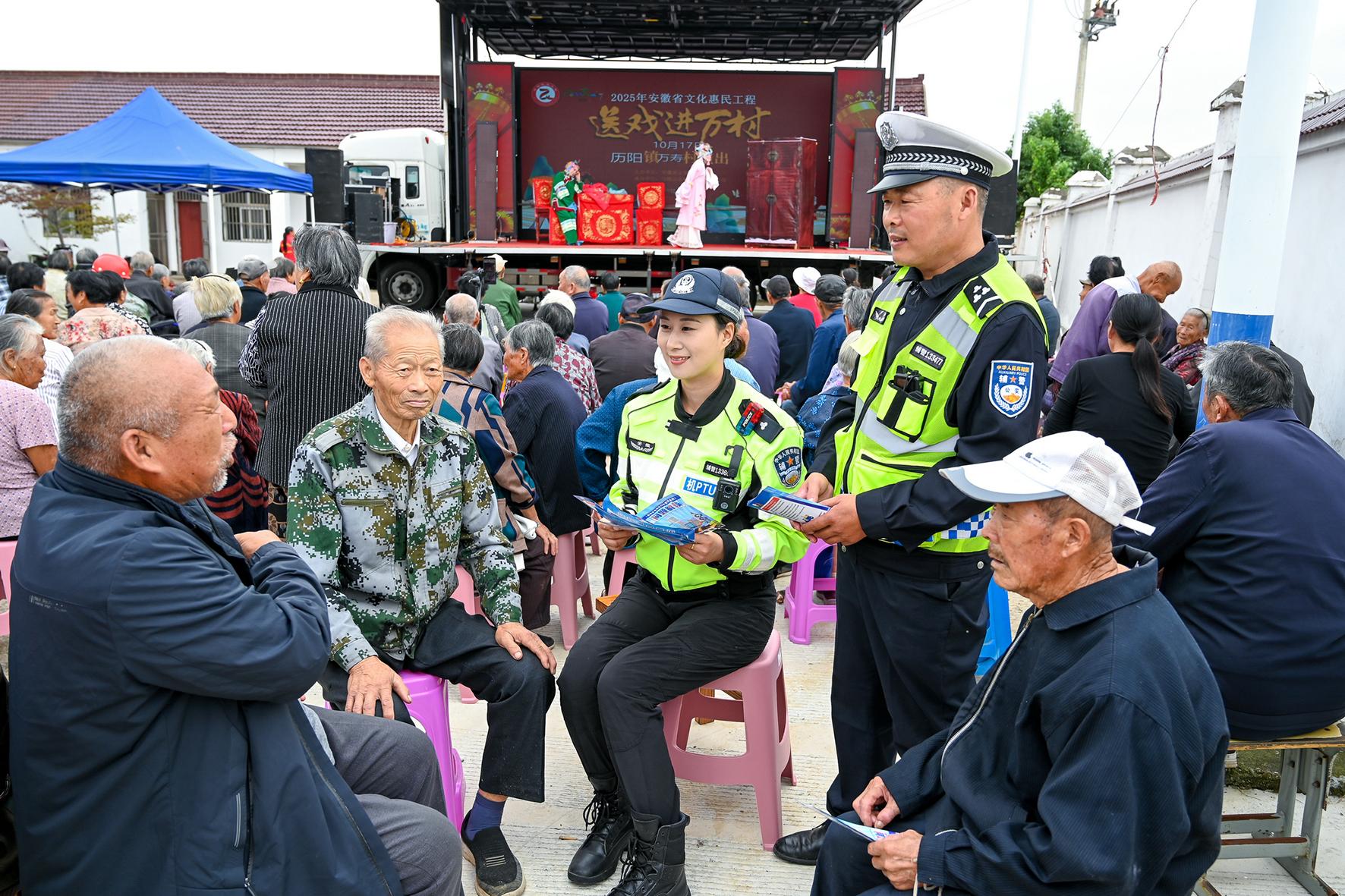 10月17日,安徽省馬鞍山市和縣公安局民警在歷陽鎮(zhèn)萬壽村“送戲下鄉(xiāng)”活動(dòng)現(xiàn)場,向村民們開展交通安全知識宣傳。