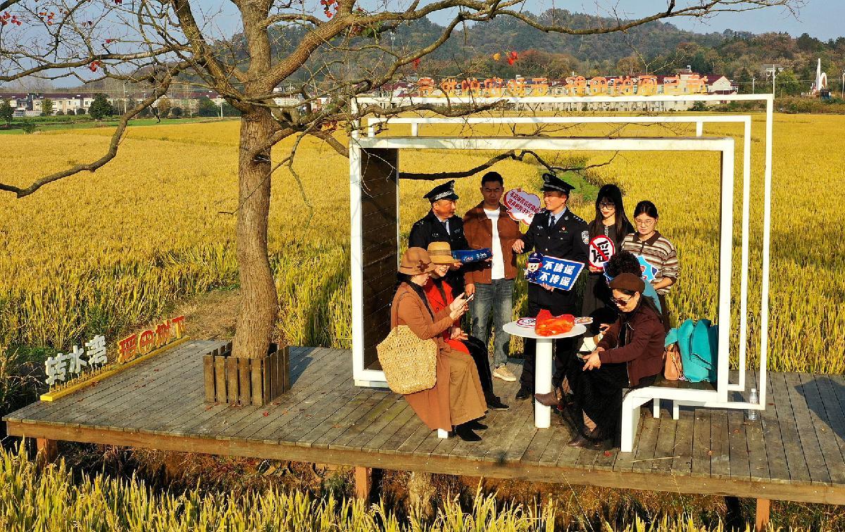 11月13日,安徽省舒城縣公安局網(wǎng)監(jiān)大隊(duì)聯(lián)合闕店派出所走進(jìn)轉(zhuǎn)水灣村“稻田樹下”打卡點(diǎn),向游客和村民開展打擊整治網(wǎng)絡(luò)謠言宣傳。