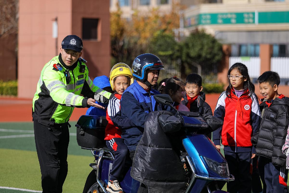 12月1日,山東省青島市公安局交通管理支隊(duì)李滄區(qū)大隊(duì)輔警在青島崇禮小學(xué)向?qū)W生講解如何安全騎乘電動摩托車。