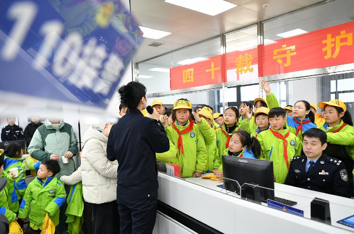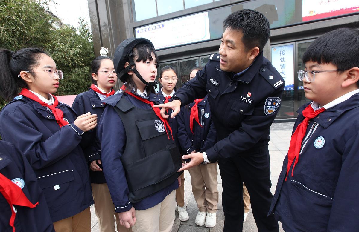1月9日,江蘇省徐州市公安局鼓樓分局豐財(cái)派出所民警給小學(xué)生介紹警用裝備知識。當(dāng)日,徐州市星源小學(xué)組織學(xué)生到豐財(cái)派出所參觀,了解警營文化,感受警察風(fēng)采,喜迎中國人民警察節(jié)。