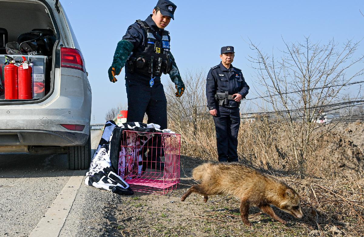 1月13日,安徽省馬鞍山市和縣公安局民警正在放歸國家二級保護野生動物“貉”。該動物在野外被網(wǎng)繩意外纏住,民警接到群眾報警及時進行了施救。