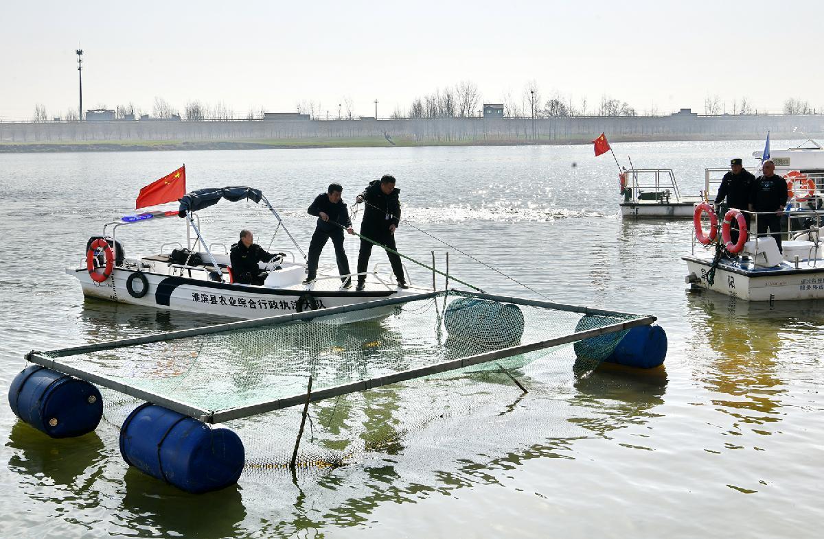 1月15日,安徽省阜南縣、霍邱縣、潁上縣農(nóng)業(yè)農(nóng)村行政執(zhí)法大隊(duì)聯(lián)合河南省信陽(yáng)市、淮濱縣、固始縣農(nóng)業(yè)農(nóng)村行政執(zhí)法大隊(duì)開(kāi)展冬季禁捕執(zhí)法專項(xiàng)行動(dòng),重點(diǎn)打擊跨區(qū)域非法捕撈、電魚(yú)行為,保護(hù)淮河生態(tài)環(huán)境及水生生物資源。