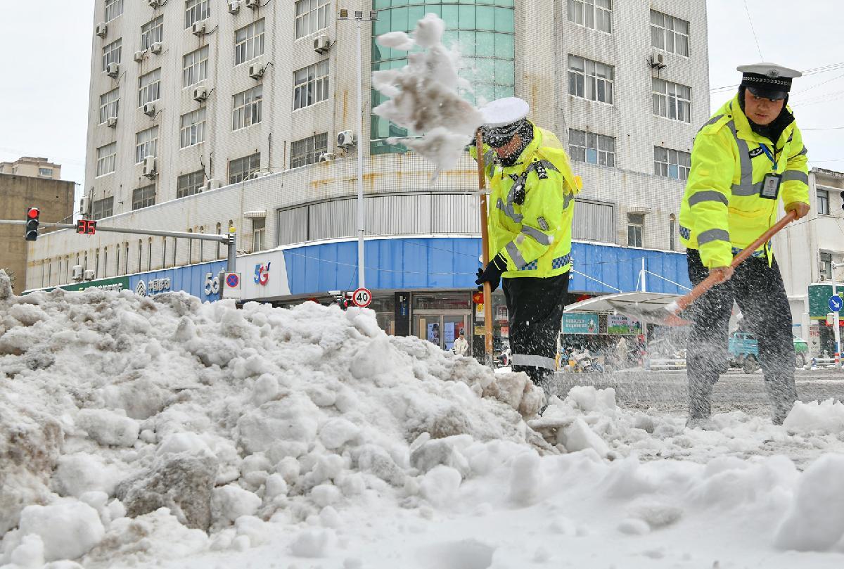 1月20日,安徽省阜南縣大范圍降雪。阜南縣公安、交通運(yùn)輸、城市管理等多部門(mén)聯(lián)動(dòng)保障交通暢通。