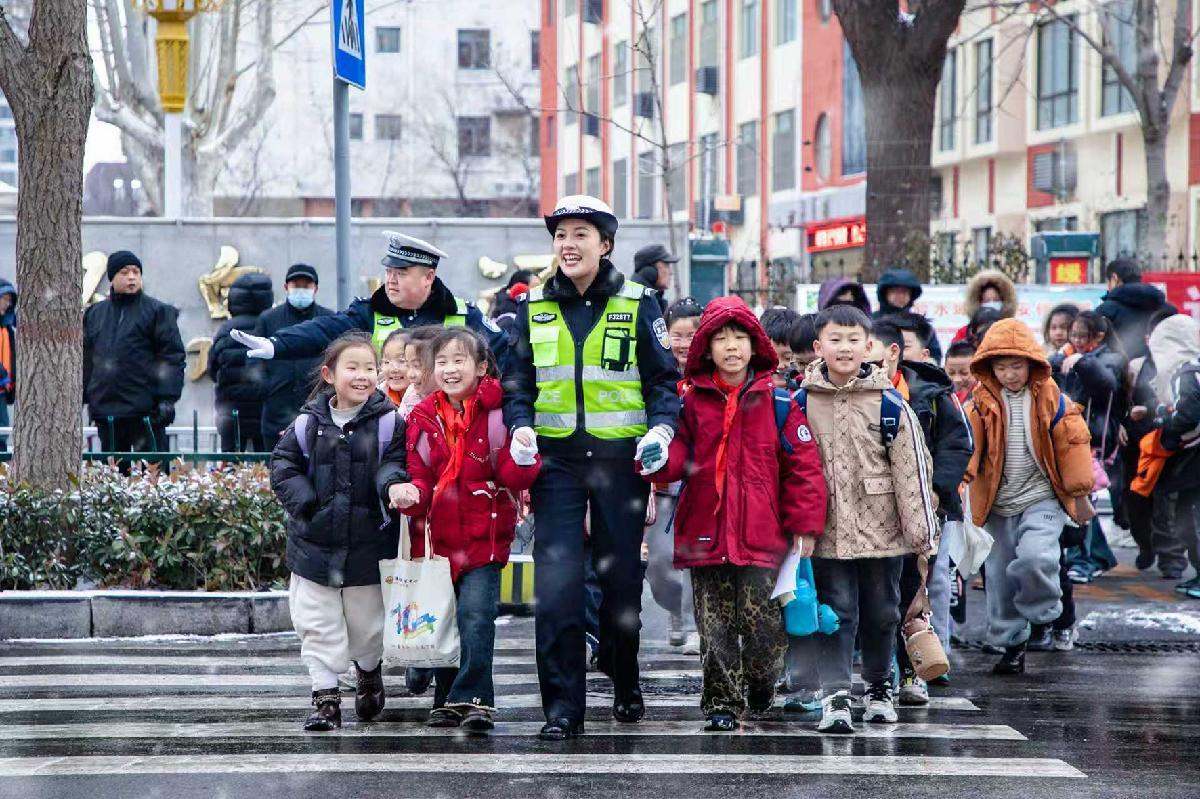 1月19日,山東省煙臺(tái)市公安局芝罘分局民警冒雪在轄區(qū)幼兒園門(mén)口執(zhí)勤,護(hù)送孩子們平安放學(xué)。