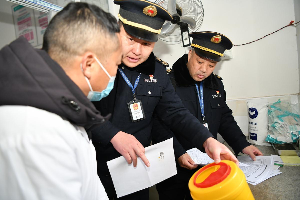 圖為1月26日,執(zhí)法人員在張寨鎮(zhèn)楊圩村衛(wèi)生室進行監(jiān)督檢查。