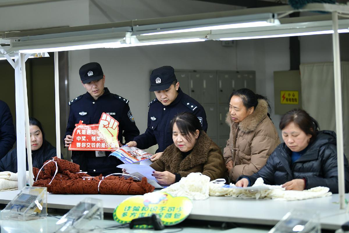 2月24日,安徽省阜南縣公安局經(jīng)濟開發(fā)區(qū)派出所民警在一家紡織企業(yè)車間為員工宣講防騙知識。
