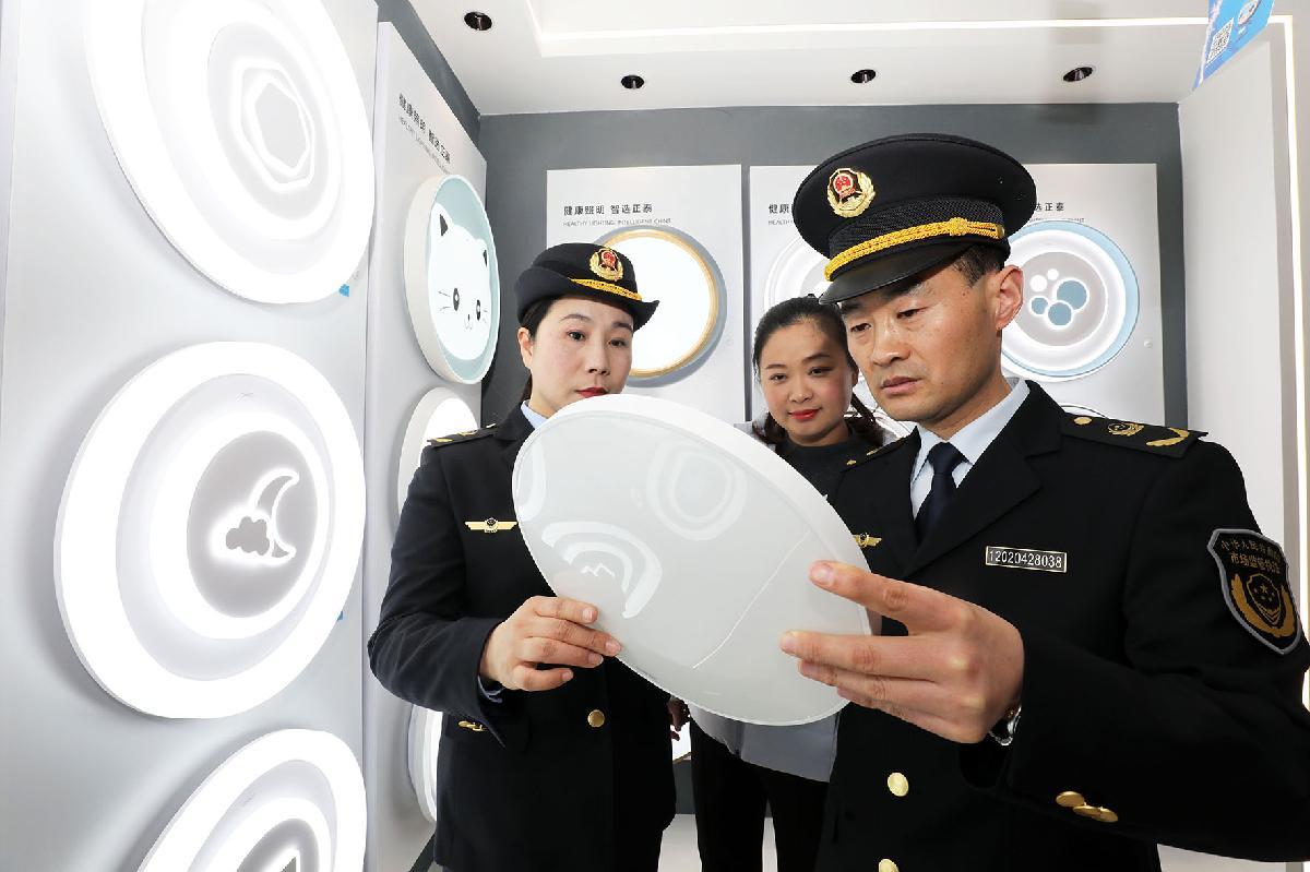 圖為3月11日,執(zhí)法人員對燈具等商品進(jìn)行檢查。