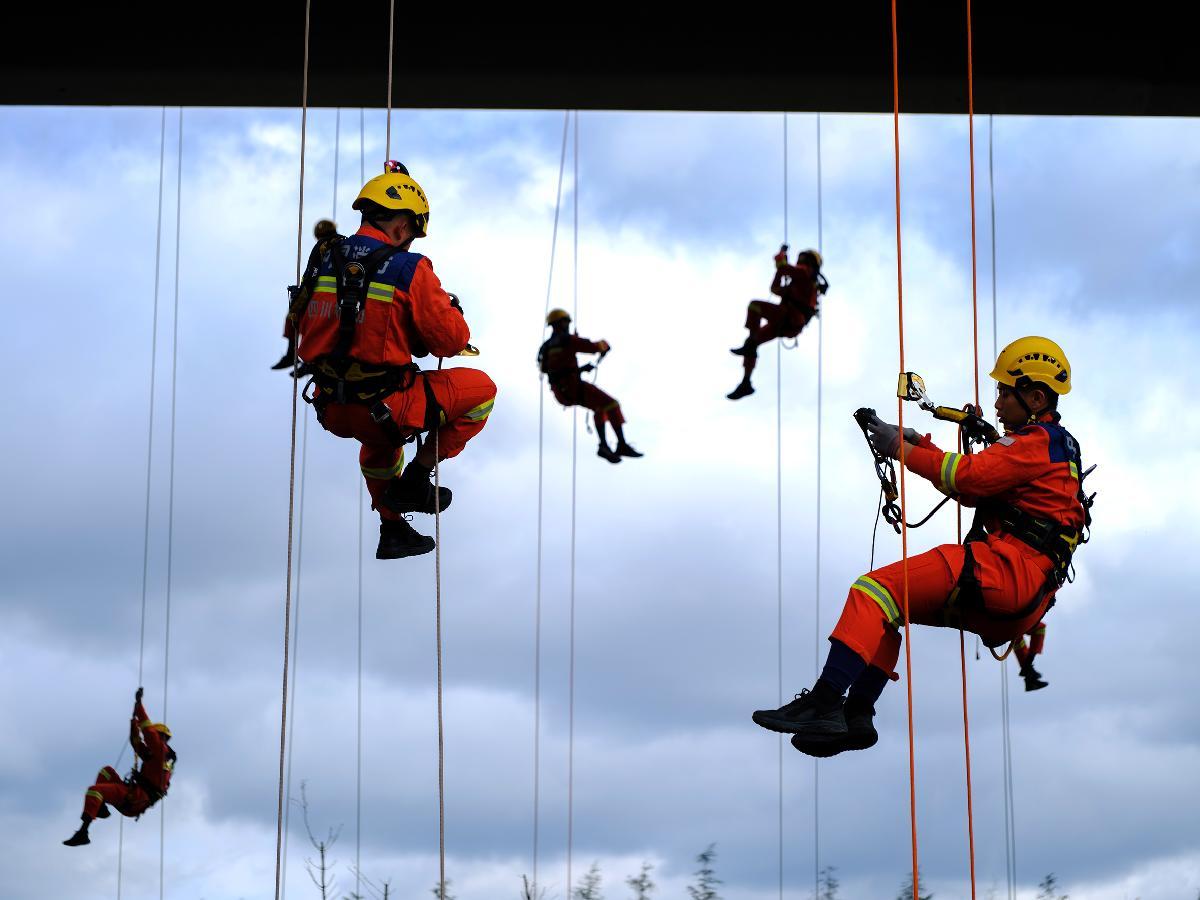 圖為新消防員進(jìn)行繩索訓(xùn)練。