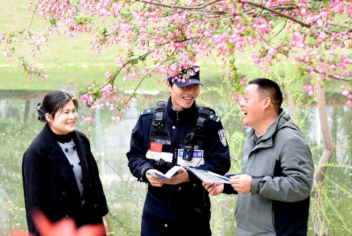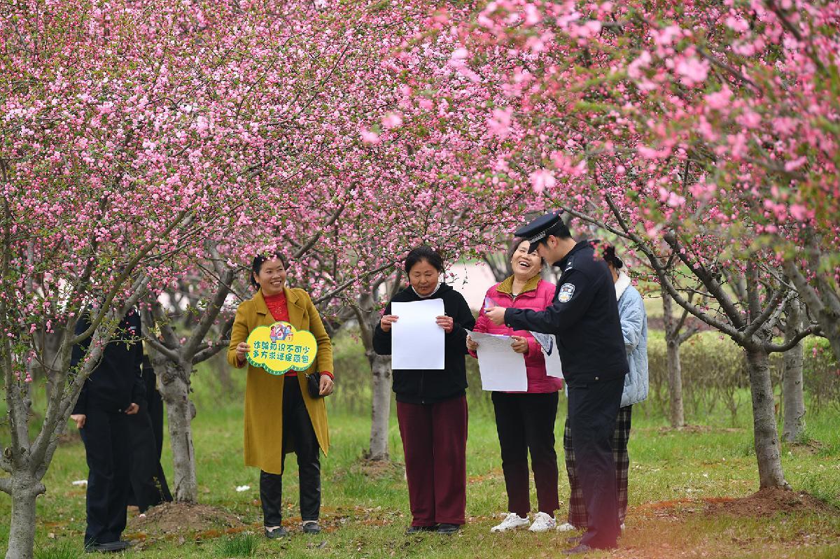 3月24日,安徽省亳州市渦陽縣公安局民警向踏青賞花的市民宣傳安全防范知識。
