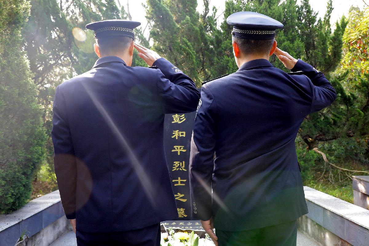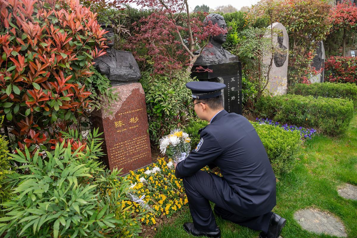 3月27日,安徽省合肥市公安局蜀山分局組織青年民警在大蜀山文化陵園開展清明祭公安英烈活動(dòng),公安英模陳彬之子、民警陳文琛祭奠父親。