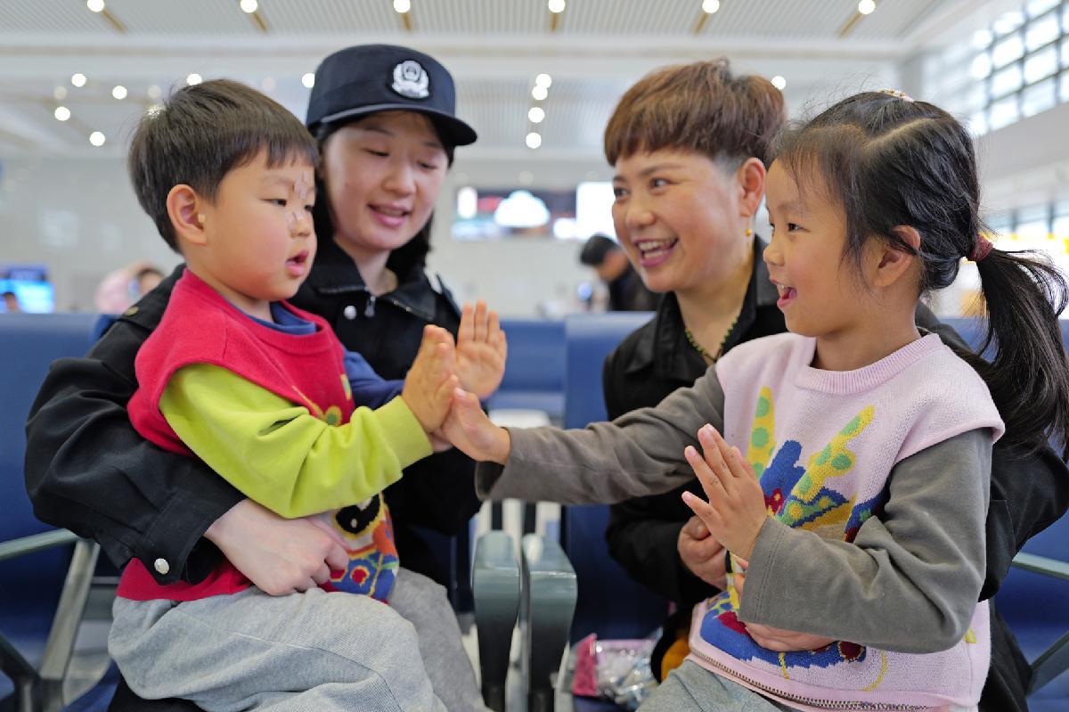 4月7日,杭州鐵路公安處嵊州新昌站派出所民警主動(dòng)幫助一對(duì)雙胞胎的奶奶耐心安撫哭鬧孩子的情緒,讓旅途多了一份安心與溫情。