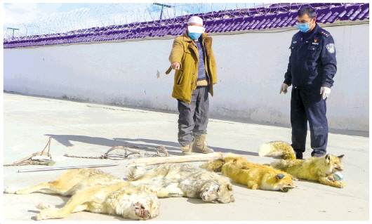 ▲ 3月2日,新疆維吾爾自治區(qū)克州邊境管理支隊木吉邊境派出所快速破獲一起捕殺販賣野生動物案,查獲已被獵殺的兩只狼、兩只狐貍。   本報記者 潘從武 本報通訊員 張佳 吳明賢 攝