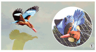 圖① 白胸翡翠落入捕鳥人的“死亡之網(wǎng)”。白胸翡翠已被列入《世界自然保護聯(lián)盟》2015年瀕危物種紅色名錄ver 3.1無危(LC)。 本報記者 鄧新建 攝