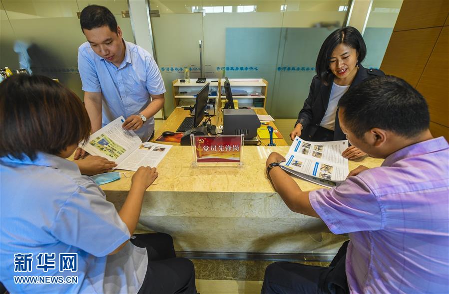 6月11日,在河北省香河縣便民服務中心窗口,黨員先鋒崗工作人員為前來辦事的企業(yè)負責人介紹辦事流程。 河北省香河縣在縣便民服務中心設(shè)立了多個黨員先鋒服務窗口,安排黨員志愿者為辦事群眾提供咨詢和代辦服務,進一步優(yōu)化辦事流程,方便居民辦事。 新華社記者 李曉果 攝