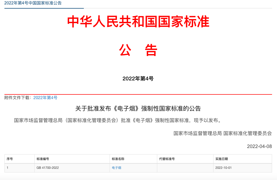 據(jù)國(guó)家標(biāo)準(zhǔn)化管理委員會(huì)官方網(wǎng)站消息,近日,國(guó)家市場(chǎng)監(jiān)督管理總局、國(guó)家標(biāo)準(zhǔn)化管理委員會(huì)批準(zhǔn)《電子煙》強(qiáng)制性國(guó)家標(biāo)準(zhǔn),現(xiàn)予以發(fā)布,自2022年10月1日起實(shí)施。