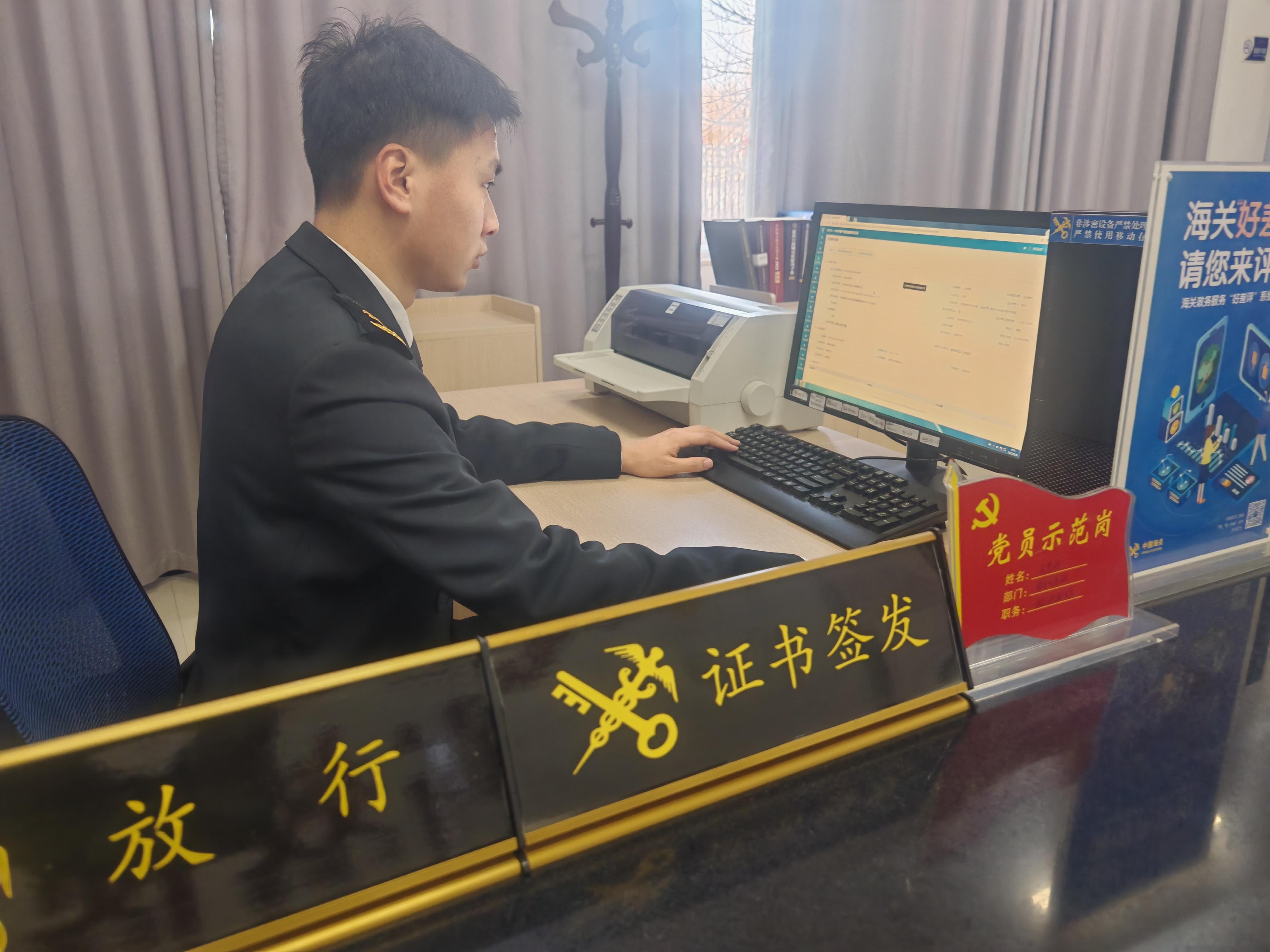 “我們通過電腦端發(fā)出申請,海關工作人員在線審核后我們即可自助打印證書并及時郵遞給國外客戶,不用親自去海關辦事窗口,節(jié)省了至少1天的時間和往返300多公里的工作成本,我們衷心為海關推出的‘企業(yè)自助打印業(yè)務’點贊?!惫现莺率狭5擂r業(yè)發(fā)展有限責任公司負責人郝宇說。
