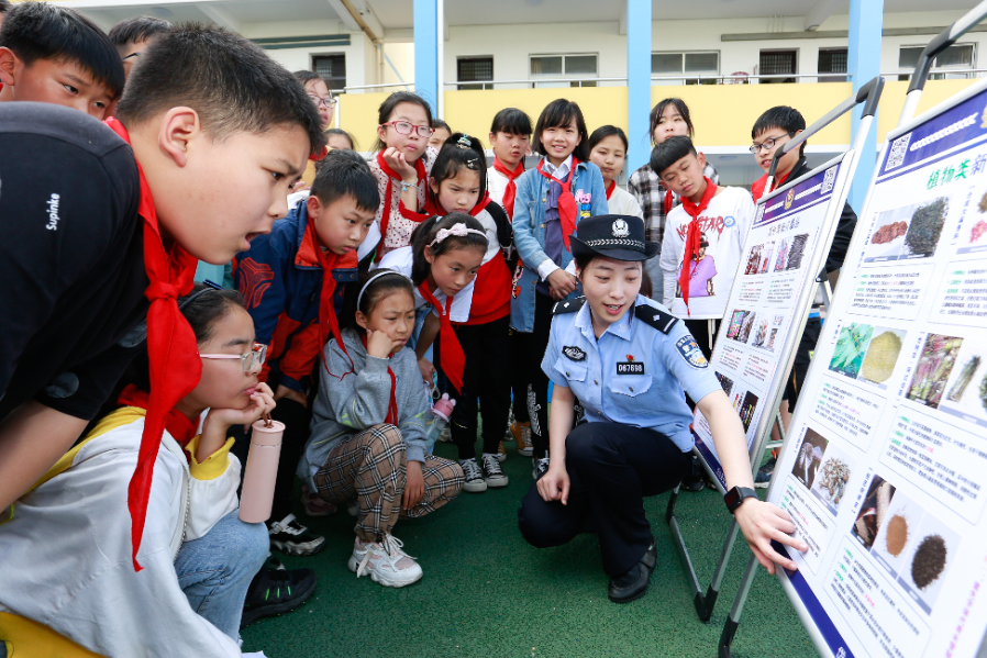 5月26日,浙江省岱山縣公安局民警來(lái)到轄區(qū)蓬山小學(xué)開展“共建無(wú)毒家園 守護(hù)紅色根脈”主題宣傳活動(dòng)。其間,民警向?qū)W生講解了植物類、食品飲料類及其他類18種國(guó)家實(shí)行整類列管的新精神活性物質(zhì)相關(guān)知識(shí),并開展禁毒拼圖、擊碎毒品等互動(dòng)游戲,進(jìn)一步提高學(xué)生們識(shí)毒、防毒、拒毒意識(shí)。圖為民警向?qū)W生講解禁毒知識(shí)。