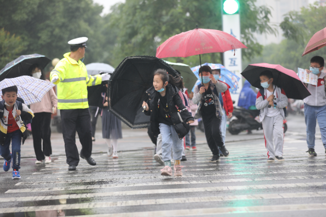5月19日下午,安徽省舒城縣降雨并伴有霧天氣,舒城縣公安局交通管理大隊(duì)在學(xué)校周邊增派“護(hù)學(xué)崗”警力,確保學(xué)生出行安全。圖為該大隊(duì)二中隊(duì)“護(hù)學(xué)崗”輔警在轄區(qū)一學(xué)校附近呵護(hù)放學(xué)小學(xué)生安全過(guò)馬路。