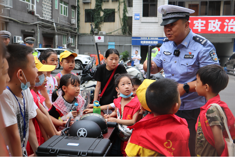 為做好暑期道路交通安全宣傳工作,增強(qiáng)未成年人的交通安全意識(shí),7月14日上午,四川省綿陽市公安局交警支隊(duì)直屬一大隊(duì)組織本地報(bào)社的“小記者”們到大隊(duì)參觀、采訪。活動(dòng)中,民警向“小記者”們介紹交警工作,講解交通安全知識(shí),還為他們展示酒精測試儀、防暴盾牌、臂盾等執(zhí)法裝備,并進(jìn)行現(xiàn)場演示。圖為民警與“小記者”互動(dòng)。