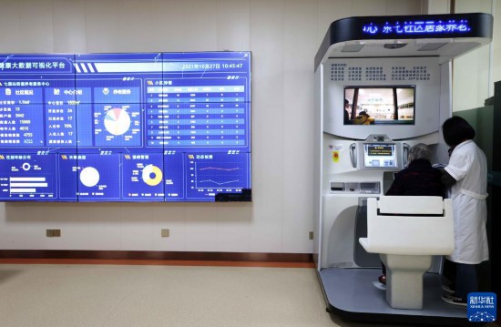10月27日,在安徽省合肥市瑤海區(qū)東七社區(qū)居家養(yǎng)老服務(wù)中心,醫(yī)生在智能體檢一體機(jī)上為老人進(jìn)行身體健康檢測(cè)。