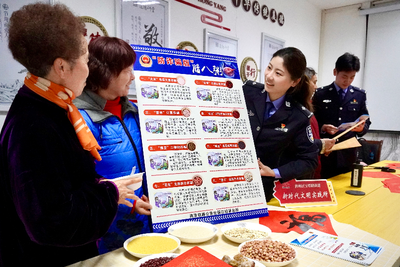 1月6日,南京鐵路公安處鎮(zhèn)江站派出所聯(lián)合江蘇省鎮(zhèn)江市潤(rùn)州區(qū)金橋社區(qū)開展了“一碗防詐臘八粥,暖心暖胃保安全”活動(dòng),民警和社區(qū)工作人員現(xiàn)場(chǎng)親手熬制臘八粥分發(fā)給社區(qū)居民,在為他們送去節(jié)日祝福的同時(shí),進(jìn)一步增強(qiáng)他們的防詐騙意識(shí)。圖為民警以常見的8種詐騙方式比作8種熬制臘八粥的食材,自制一碗防詐騙版“臘八粥”,向群眾講解防詐騙知識(shí)。
