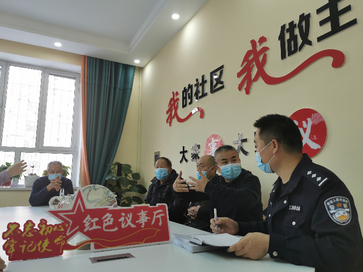 警務(wù)室民警和社區(qū)工作人員一起向社區(qū)居民征求社情民意。