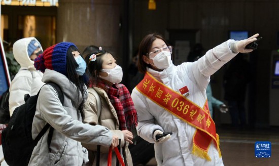 1月28日,北京西站愛心服務隊的隊員指導旅客乘車出行。