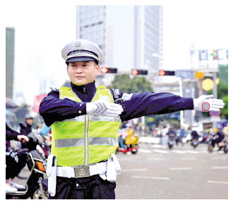 圖為王偉堅守崗位指揮交通。