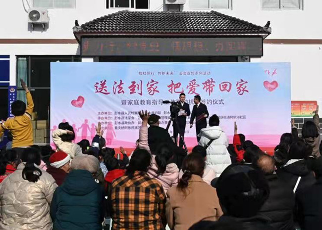 日前,重慶市彭水縣檢察院聯(lián)合縣婦聯(lián)、紹慶街道阿依河社區(qū),開展“檢社同行·共護(hù)未來(lái)”之“送法到家·把愛帶回家”普法活動(dòng),通過(guò)自創(chuàng)法治小品、快板和法律知識(shí)有獎(jiǎng)競(jìng)答等活動(dòng),為社區(qū)居民講解家庭教育促進(jìn)法和“雙減”政策,教家長(zhǎng)“依法帶娃”。當(dāng)天,三方還會(huì)簽了家庭教育指導(dǎo)工作聯(lián)動(dòng)機(jī)制。