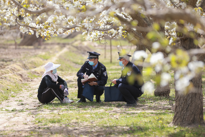 4月初,甘肅省皋蘭縣什川古鎮(zhèn)的梨園內(nèi)梨花競相開放,受疫情影響,梨園旅游項目暫時關(guān)閉,當(dāng)?shù)毓r(nóng)們忙著授粉,皋蘭縣公安局什川派出所民警穿梭在梨園田間地頭,向群眾普及安全防范知識,切實為農(nóng)業(yè)生產(chǎn)保駕護(hù)航。圖為4月6日,民警為果農(nóng)宣講安全防范知識。