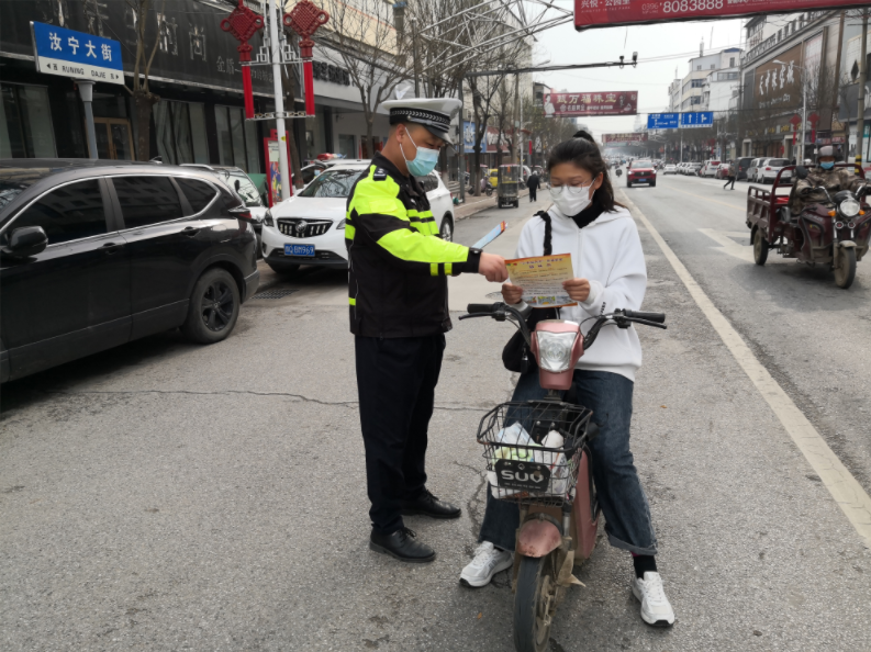 連日來(lái),河南省汝南縣公安局交警大隊(duì)民警走上街頭開展“一盔一帶,安全常在”專項(xiàng)宣傳。圖為民警向過(guò)往群眾發(fā)放“一盔一帶”交通安全宣傳頁(yè)。