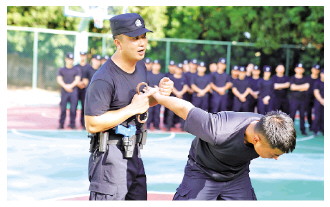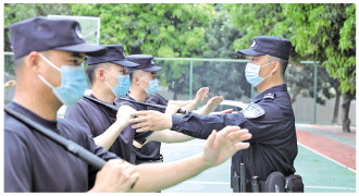 圖① 符豪(左)正在向民警教授警務(wù)實(shí)戰(zhàn)技能。