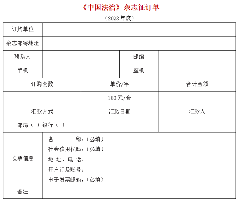 ★匯款時請務(wù)必標(biāo)明“中國法治+訂購套數(shù)”,個人匯款另需注明“單位名稱”。