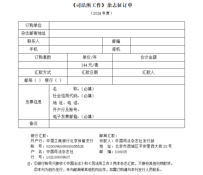 注:①銀行賬號只接收《中國法治》和《司法所工作》兩本雜志匯款,不接收其他刊物款項。