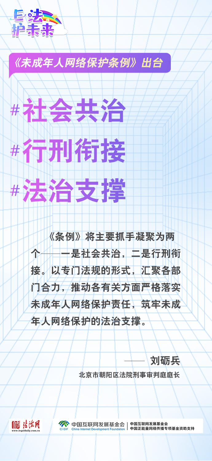法治網(wǎng)特推出一組“專家有言”海報(bào),內(nèi)容涵蓋《條例》出臺(tái)的現(xiàn)實(shí)意義和時(shí)代價(jià)值、網(wǎng)絡(luò)素養(yǎng)促進(jìn)、網(wǎng)絡(luò)信息內(nèi)容規(guī)范、個(gè)人信息網(wǎng)絡(luò)保護(hù)、網(wǎng)絡(luò)沉迷防治等,充分展現(xiàn)《條例》的出臺(tái)是我國互聯(lián)網(wǎng)治理領(lǐng)域的法治成果,彰顯中國在未成年人網(wǎng)絡(luò)保護(hù)領(lǐng)域的擔(dān)當(dāng),為全球未成年人網(wǎng)絡(luò)空間治理提供指引和樣本。