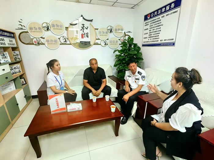 8月24日下午,在烏魯木齊市沙依巴克區(qū)騎馬山街道西盛社區(qū)“百姓說事點(diǎn)”,街道司法所專職人民調(diào)解員楊新團(tuán)(右二)和社區(qū)人民調(diào)解員熱西旦·那斯?fàn)枺ㄗ笠唬┏晒φ{(diào)解一起鄰里之間因噪聲污染引發(fā)的矛盾糾紛。法治日報全媒體記者 潘從武 攝