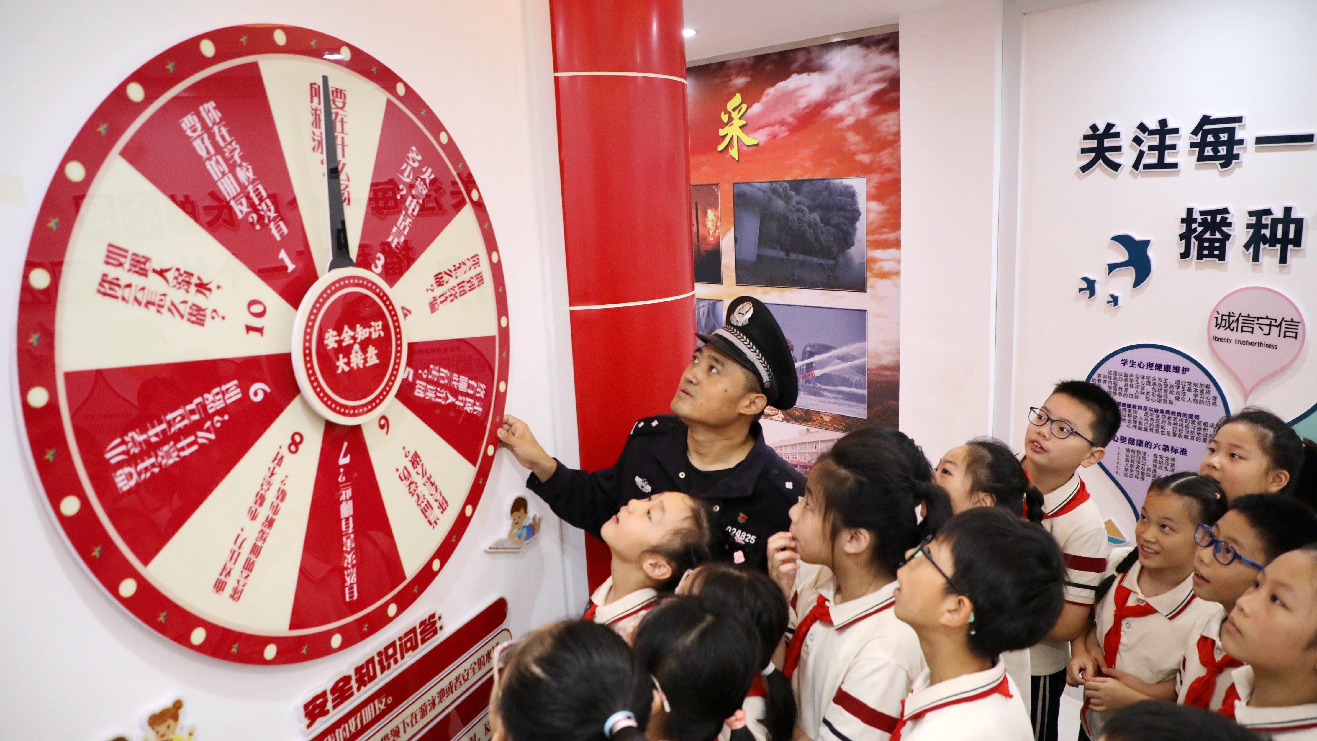 近日,江西省九江市公安局潯陽分局人民路派出所民警來到轄區(qū)湖濱小學,開展主題為“如何保護自身安全,預防意外事件發(fā)生”安全教育進校園活動。圖為民警用安全知識大轉(zhuǎn)盤向?qū)W生講解安全知識。通訊員 游建棟 攝
