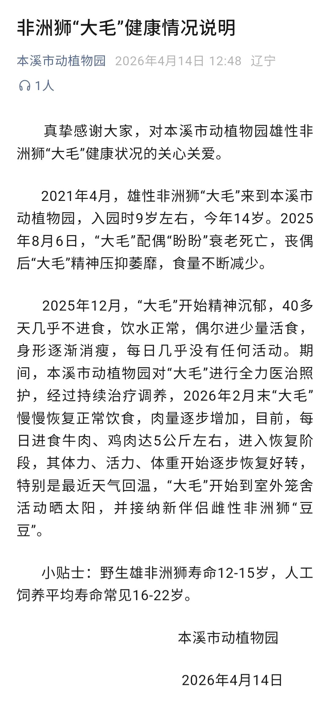2021年4月,雄性非洲獅“大毛”來(lái)到本溪市動(dòng)植物園,入園時(shí)9歲左右,今年14歲。2025年8月6日,“大毛”配偶“盼盼”衰老死亡,喪偶后“大毛”精神壓抑萎靡,食量不斷減少。