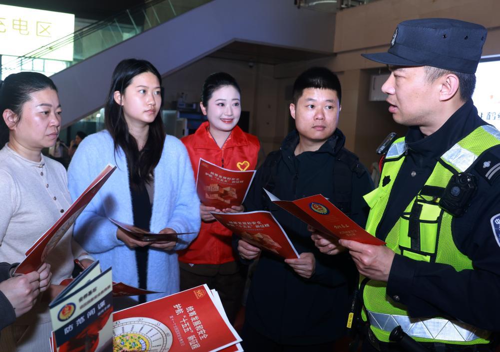 4月13日,武漢鐵路公安處民警、志愿者在湖北省漢口站向旅客宣講防范化解危害國家安全行為的知識。新華社發(fā)(趙軍 攝)
