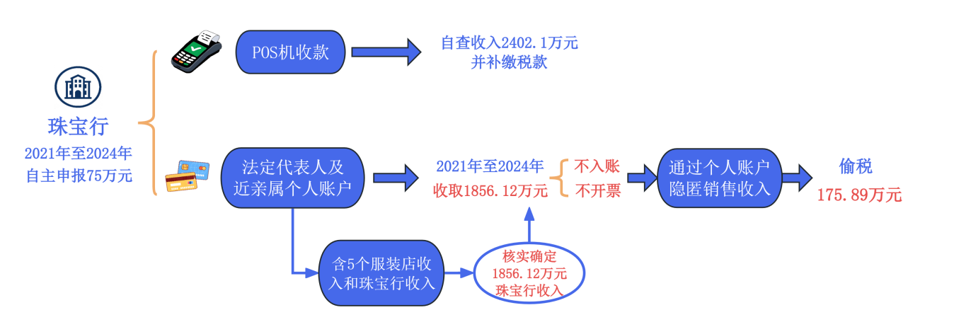 很快,富晨珠寶行自查調(diào)增2021-2024年?duì)I業(yè)收入至2402.1萬元,并補(bǔ)繳了稅費(fèi)款,而且其提供的佐證資料中,店內(nèi)POS機(jī)收款金額與自查后的2402.1萬元收入相對應(yīng),表面上雖已賬實(shí)相符,但對比同地段、同規(guī)模的其他珠寶行,其自查后年均申報收入仍然偏低。對此,阿克蘇地區(qū)稅務(wù)局稽查局決定對其立案檢查。