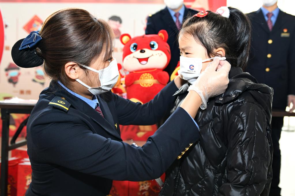 1月16日,在常州站候車室防疫宣傳活動現(xiàn)場,鐵路工作人員為候車小朋友戴好口罩。新華社發(fā)(史康 攝)