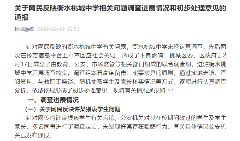 關(guān)于網(wǎng)民反映衡水桃城中學(xué)相關(guān)問題調(diào)查進(jìn)展情況和初步處理意見的通報